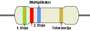 Boja | Vrijednost | Multiplkator | Multiplikator | Tolerancija |